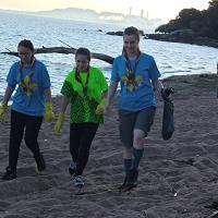 Nós usamos luvas e ganchos, nos separando em trios, cada um recolhendo um tipo de lixo, e as tampinhas plásticas serão lavadas e levadas para uma instituição.