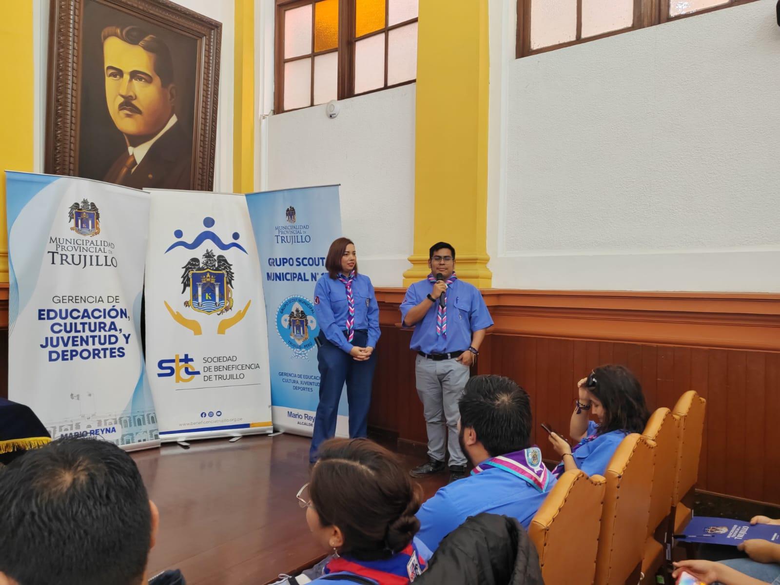 Los Scouts de Trujillo,en el Día Mundial de la Paz, abordando la problemática de la violencia en la ciudad. Contaron con el apoyo estratégico de la Municipalidad Provincial de Trujillo. Los scouts recibiendo formación en liderazgo y organización de eventos. El encuentro, de tres horas, tuvo lugar en la Beneficencia Pública de Trujillo, con la participación de jóvenes de instituciones educativas locales, quienes asistieron a discursos y conversatorios preparados por los scouts