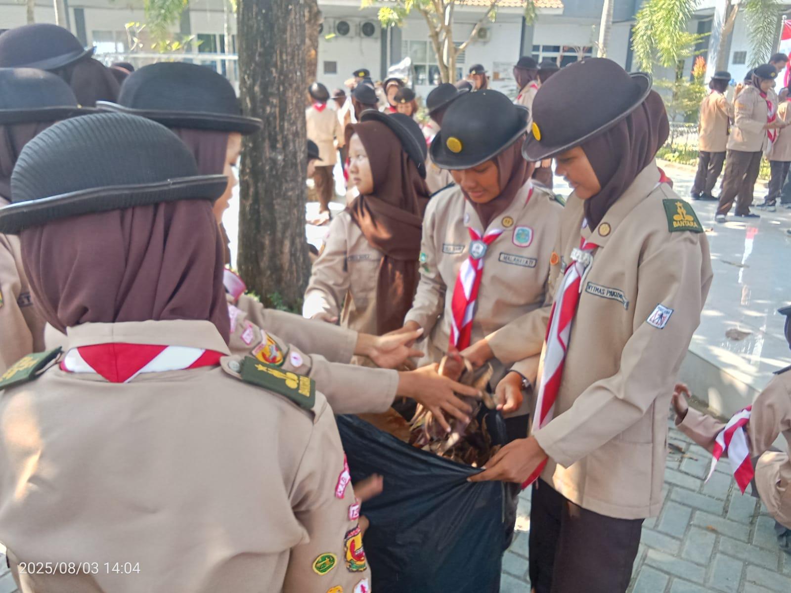 permainan yaitu kita kumpulkan 100 peserta, kita bercerita bahwa nenek moyang kita seorang pelaut suka menangkap ikan, bayangkan tempat ini adalah lautan, silahkan kakak tangkap ikannya, dan lelang di TPI, alhasil seluruh peserta berebut mengambil sampah daun dan memasukkan ke wadahnya