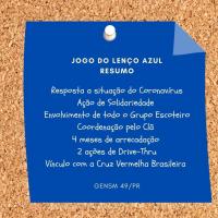 Resumo: O cenário que se apresenta em todo o mundo devido a COVID-19 e os consequentes atos para uma sociedade, no que diz respeito a fragilidade financeira, apresentação de carências e não atendimento como necessidades básicas. Propomos dentro do contexto em que esta o Grupo Escoteiro Nossa Senhora Medianeira, cria-se o Jogo do Lenço Azul.