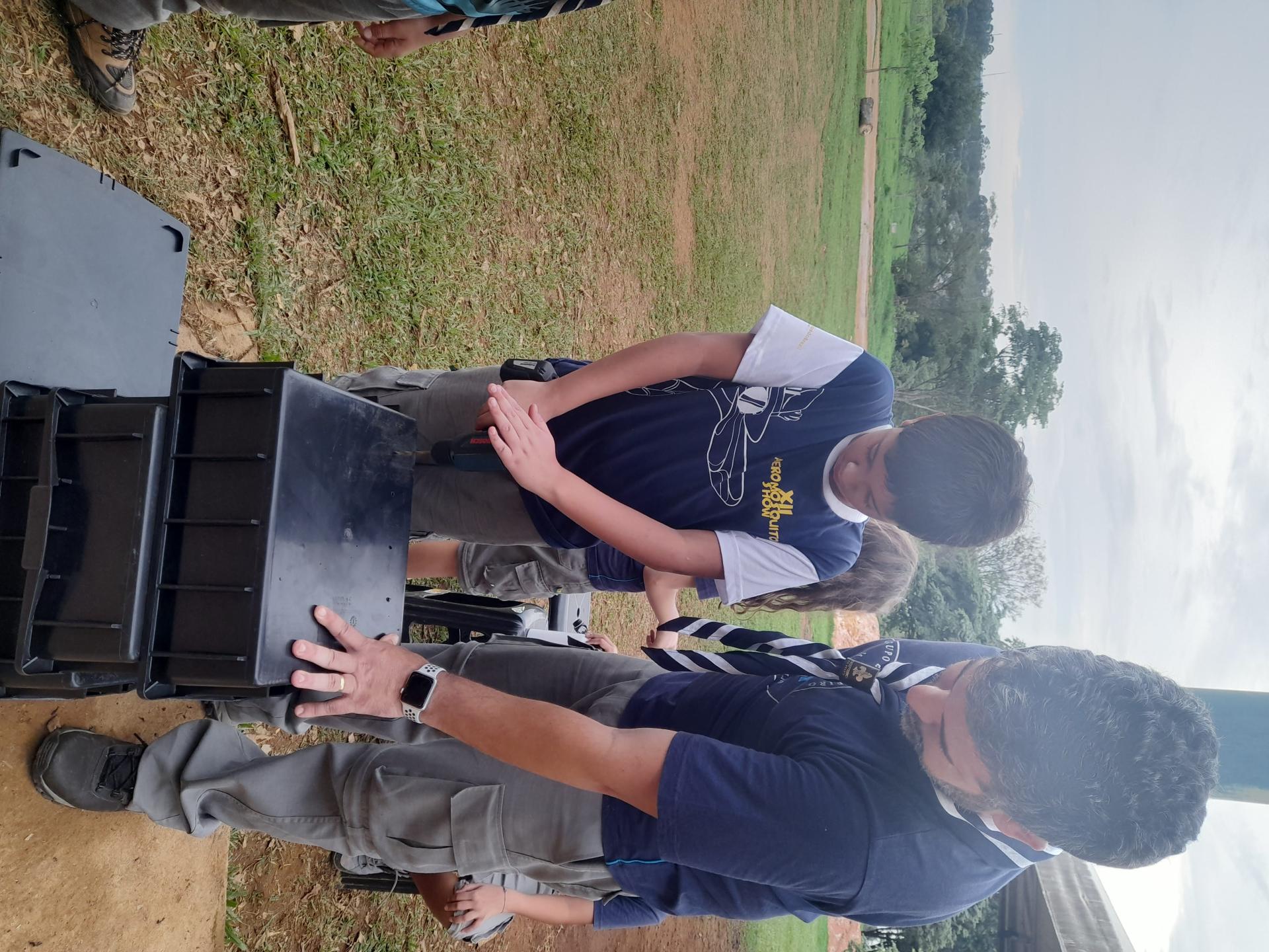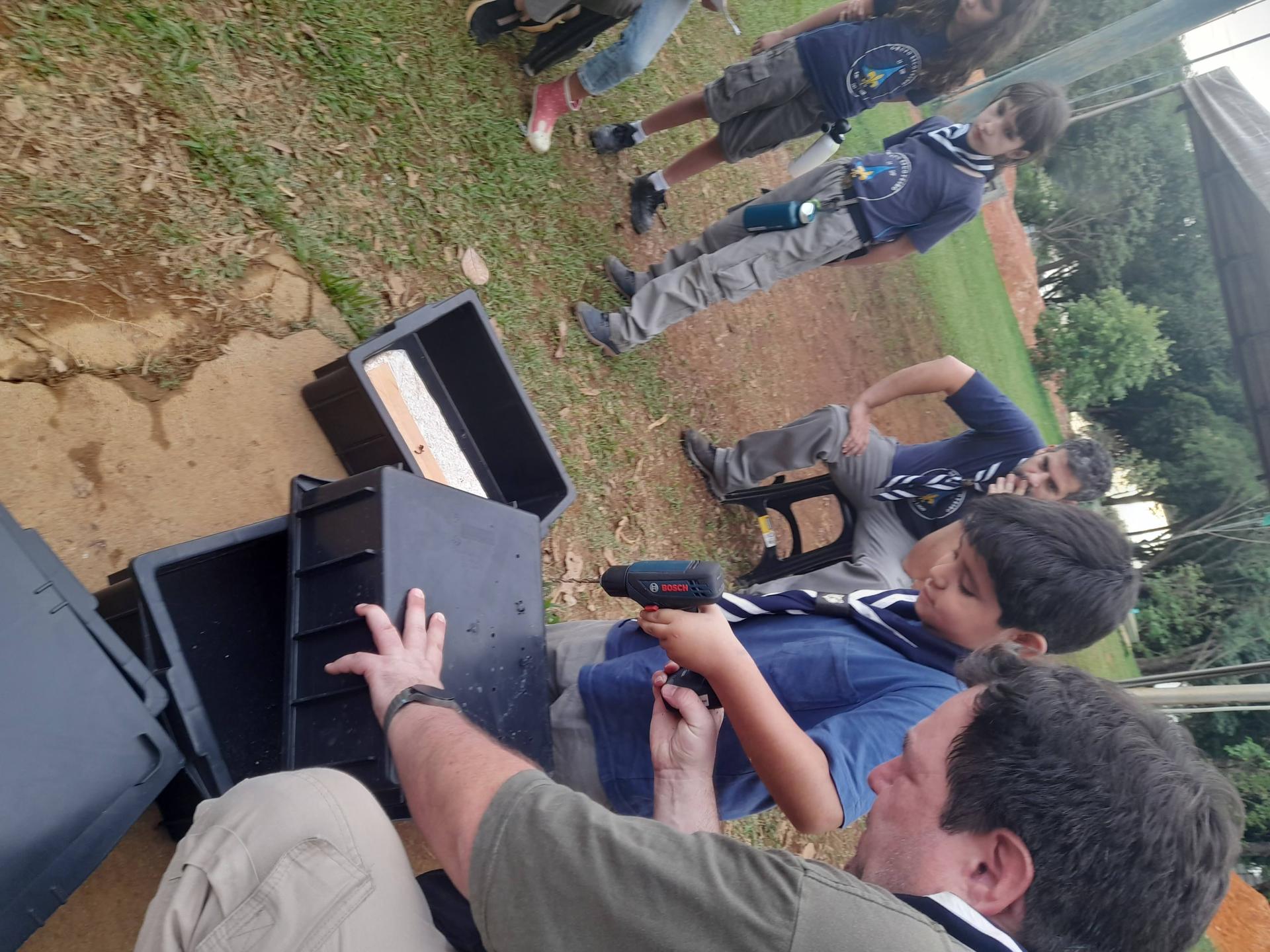 Os lobinhos montaram a composteira e ao final do dia coletaram os materiais orgânicos e fizeram a primeira carga da composteira.