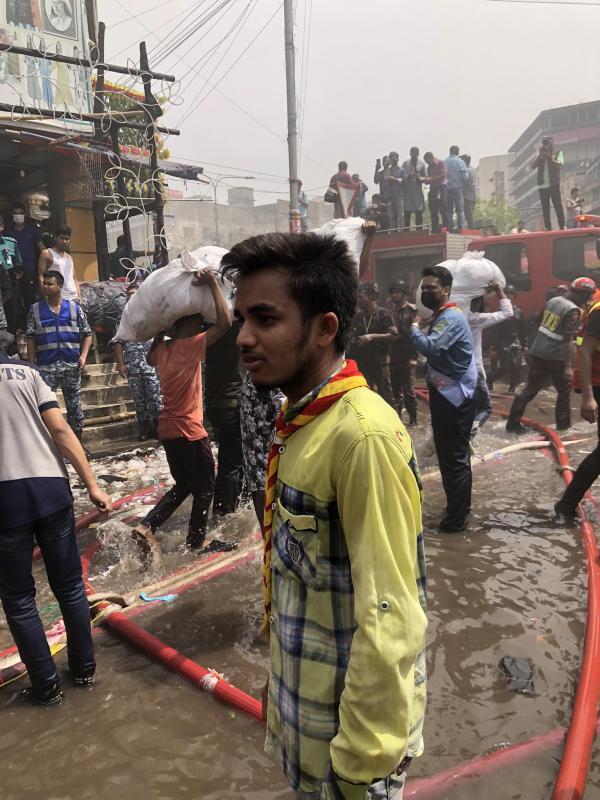 সেখানে প্রায় কয়েক হাজার দোকানদার তাদের শেষ রক্ষা করার জন্য যথাসাধ্য চেষ্টা করছিল।সেখানে আমরা সাধ্যমত সাহায্য করেছি।বাংলাদেশ ফায়ার সার্ভিস, বিমান বাহিনী, নৌবাহিনী ছাড়াও অনেক সরকারি, বেসরকারি সংস্থা নিজ প্রচেষ্টায় আগুন নিয়ন্ত্রণে সহায়তা করেছে।আমরাও সেখানে তাদের সাহায্য করার জন্য যথাসাধ্য চেষ্টা করেছি।