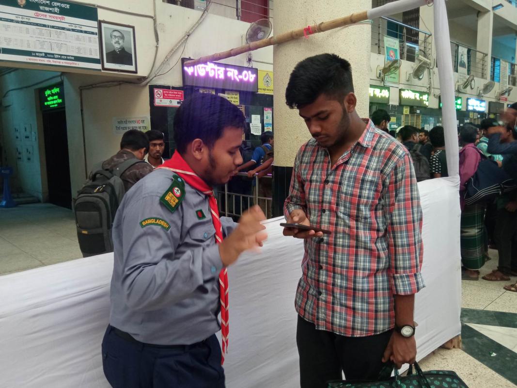 আমি কৃতজ্ঞতার সঙ্গে উল্লেখ করতে চাই যে, বাংলাদেশ স্কাউটস রেলওয়ে অঞ্চলের রোভার সদস্যরা এ প্রকল্প বাস্তবায়নে গুরুত্বপূর্ণ ভূমিকা পালন করেছেন। তারা যাত্রীদের সুবিধার্থে নির্দিষ্ট স্থানে সেবা বুথ স্থাপন করে সহযোগিতা করেছেন। আমি তাদের সাথে মিলে যাত্রীদের টিকিট যাচাকরে ট্রেনে ওঠা-নামার সময় ভারী ব্যাগ বহনে সহায়তা এবং নির্ধারিত সিট খুঁজে পেতে দিকনির্দেশনা প্রদান করেছি।