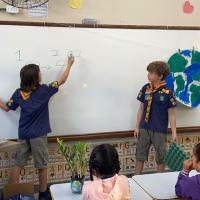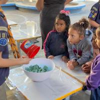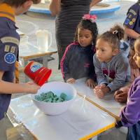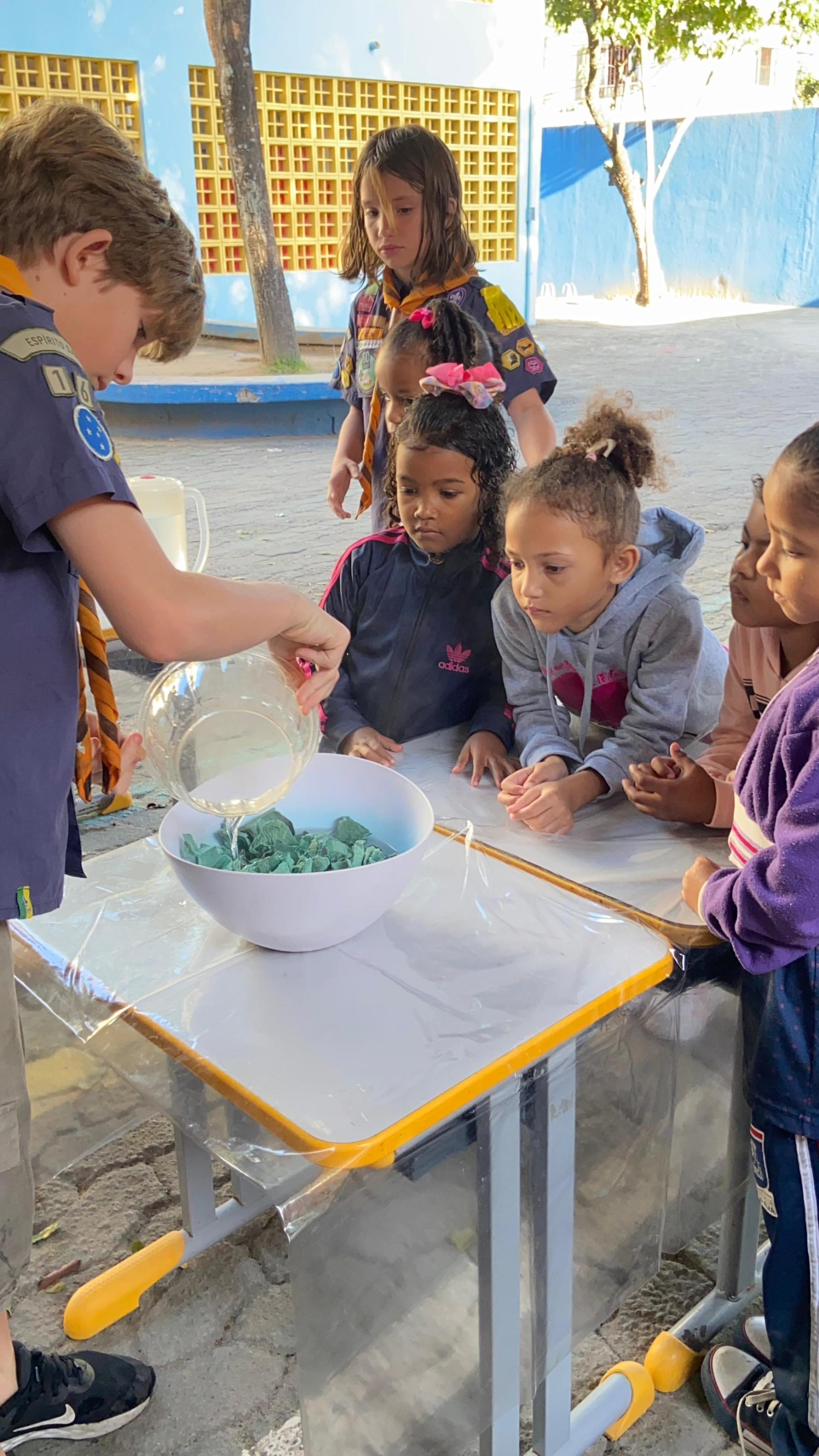 Coleta do material: cada criança e os escoteiros buscaram caixas de ovos vazias que seriam descartadas. As estações de preparação foram preparadas: corte do material, hidratação com água quente, trituração, adicão das sementes, remoção da água, formação da folha e secagem. As crianças da escola que preparam as folhas, sob a orientação dos escoteiros.