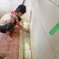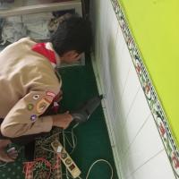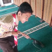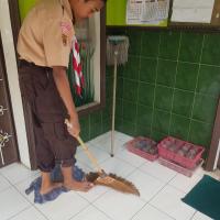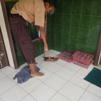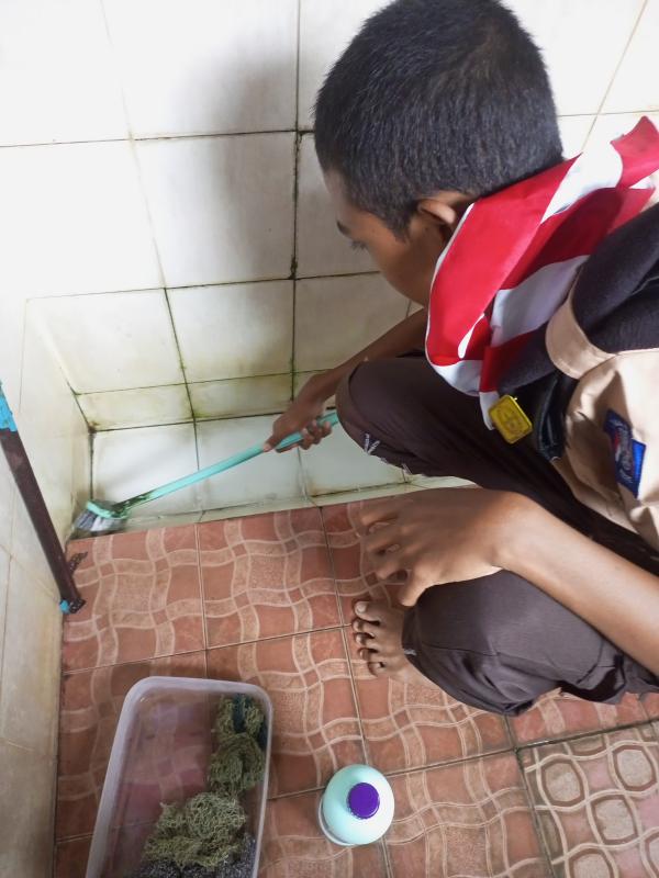 Kita berdua mulai membersihkan sekitar musholla. Dilanjutkan dengan membersihkan bagian dalam musholla, seperti tempat sholat, tempat wudhu dan lain sebagainya. Pada tempat sholat, kita membersihkan sajadah dengan vacum cleaner atau penyedot debu. Setelah itu, dilanjutkan membersihkan tempat wudhu dengan menyikat kotoran yang menempel pada saluran air dan diberi cairan pembersih kerak.