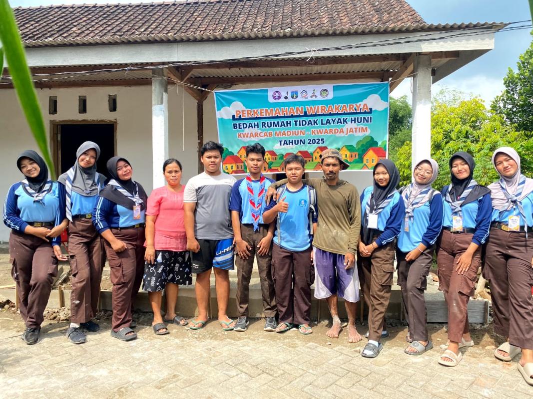 Kami dari kabupaten madiun mengikuti perkemahan wirakaya tahun 2025. Disini kita mendapatkan banyak pengalaman contohnya melihat step pembangunan rumah, kita saling gotong royong, agar rumah tersebut layak huni.