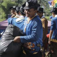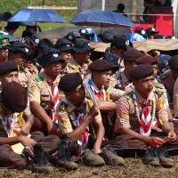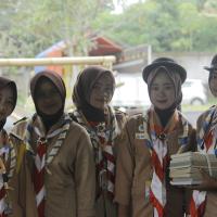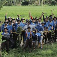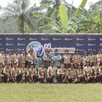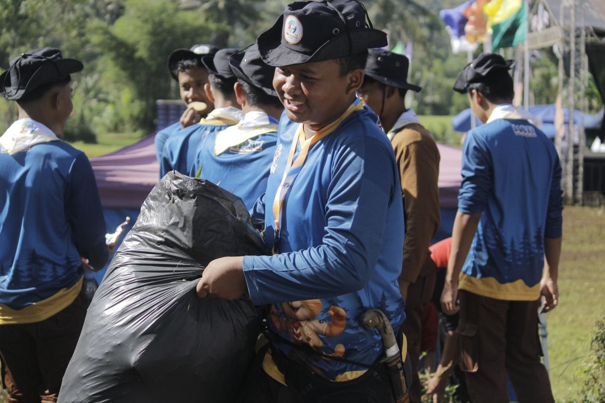 yaitudengan cara kami membersihkan sampah, reboisasi, pembuatan bak sampah dll, selain itu kami ada beberapa kegiatan di acara tersebut, seperti kegiatan fisik, non-fisik, materi, giat umum & budaya. kami menggunakan identitas pramuka ketika kami tidak menggunakan seragam Pramuka lengkap, seperti scraft,topi rimba kegiatan, jersey kegiatan,dan id card perserta