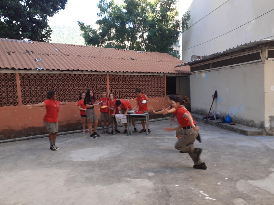 Foi por meio de um jogo educativo com perguntas e respostas . As pessoas que errassem as respostas tomava torta na cara. Depois os jovens da patrulha explicavam a resposta certa.