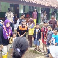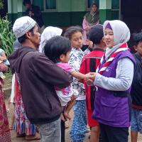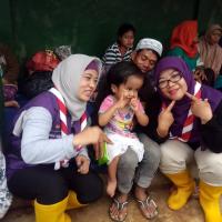 Pramuka Peduli (Scout Care) of Bogor City, send foods, cloths, diapers, and sanitary pads for flood survivor in Nanggung Village, under Mounth Salak area, Bogor (75 km Southern Jakarta, Indonesia). Task Force (Satgas) Leader of Bogor Scout Care Kak Rangga, also WOSM Consultant for Humanitarian Action and National Commissionair in Gerakan Pramuka, play and sing with the children. He accompanied by Scout Leaders and member of Satgas from Bogor City like Ka Endang, Ka Nita, Ka Teti, Ka Cece, and Ka Mila. As well the Rovers like Sadam, Ergi, Irgi, Riris and Rizki.