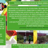 1. Inicie con venta de bisutería artesanal y donaciones 2.Autorización por la directora del plantel 3.Fumigación de áreas verdes 4.Corte de maleza y podar áreas verdes (incluyendo arboles) 5.Convocatoria a provincia y a grupo para recolección de residuo 6. Recolección de residuo 7.Soldadura de 15 sillas no funcionales y una mesa 6.Plática con los alumnos del plantel 7. Actividad con los alumnos del plantel 8. Cierre de actividades y entrega de las áreas verdes a la directora del plantel