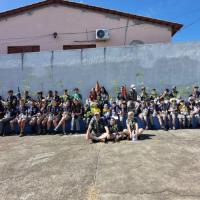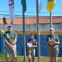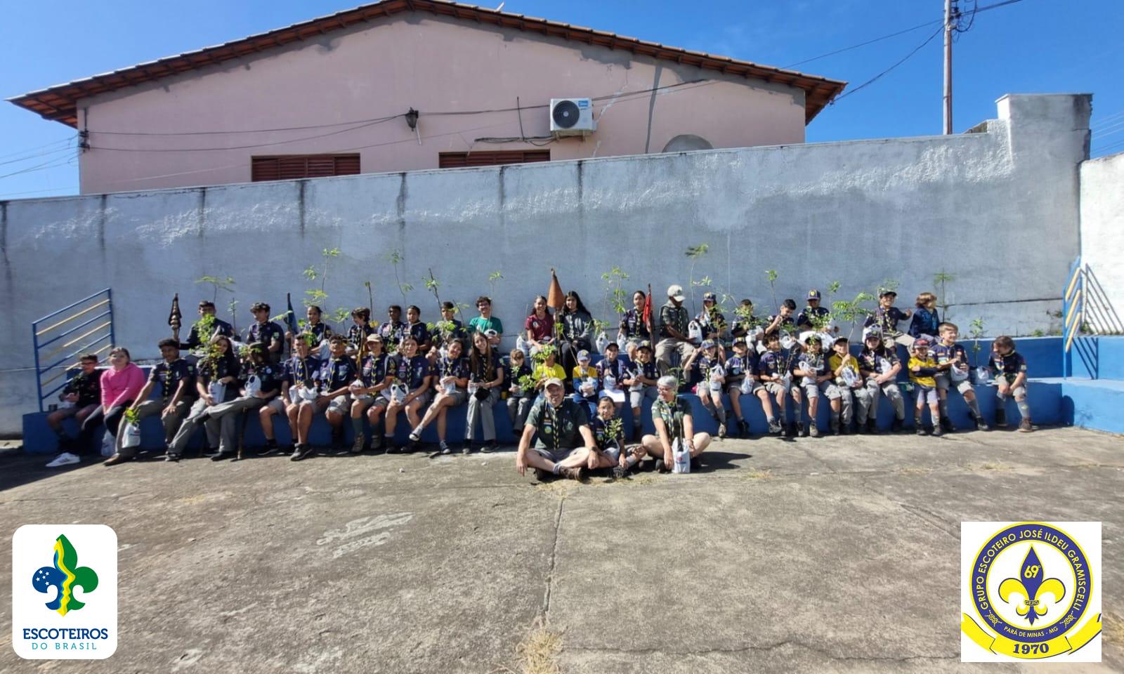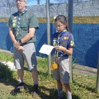4) Entreguei os cadernos reciclados no Projeto Bola de Gude e uma muda de árvore para cada lobinho e escoteiro.