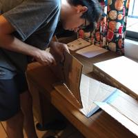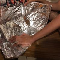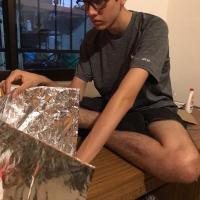 En este reto creamos una cocina casera que sirve para preparar alimentos aprovechando la luz del sol. En este caso utilizamos cartón, papel aluminio, pegamento, cinta gris y cutter. Cortamos un pedazo de cartón de una caja, de tal forma que no tuvieramos que pegar varios pedazos. Le dimos la forma requerida e hicimos unn corte adicional para que quedara de forma que el papel aluminio con el que lo forrasemos, concentrara toda la luz en un solo punto, como una olla o sartén.