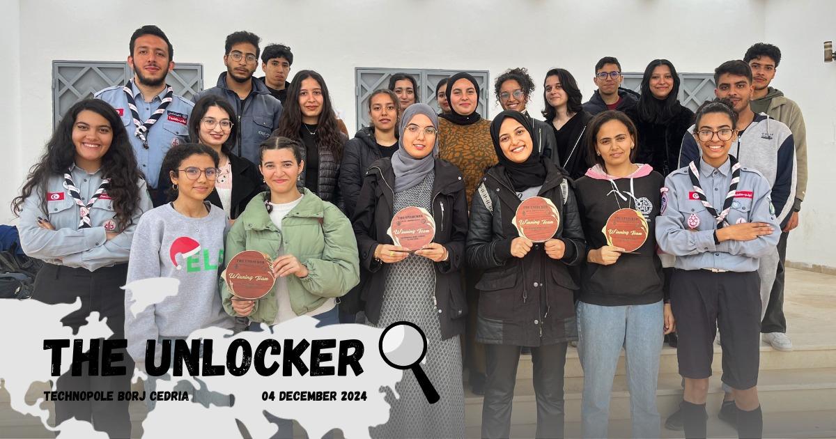We organized The Unlocker event on December 4th at Technopole Borj Cedria with 50 participants in 10 teams. The event included multiple stages: The Fate with one-word questions, Secrets Gate where survivors solved puzzles, Shuffle where teams exchanged members, and World of Theme for quick-thinking challenges. In the final stage, teams solved a puzzle using clues. The event ran smoothly, engaging participants in every phase.