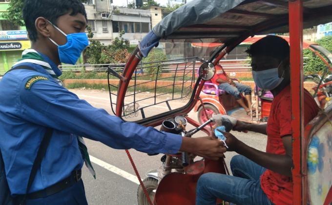 Distributing free masks and hand sanitizers