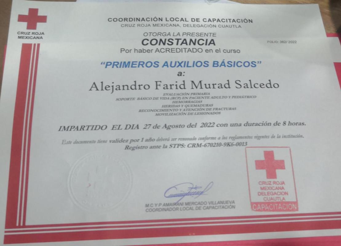 Para garantizar la seguridad en campamentos, tomé capacitaciones en seguridad forestal y primeros auxilios, para mantener el bienestar físico de los y las scouts en mi entorno, para esto busqué las capacitaciones por parte de la cruz roja mexicana y me certifiqué como primer auxiliar. Esto es importante para el desarrollo de nuestra vida campista porque garantizar la seguridad es un hecho que debe ser tomado por todos los miembros de una patrulla. Siempre listos para servir!