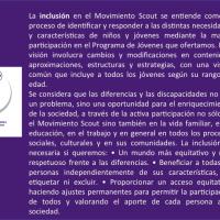 Se considera que las diferencias y las discapacidades no son un problema, sino una oportunidad para el enriquecimiento de la sociedad, a través de la activa participación no sólo en el Movimiento Scout sino también en la vida familiar, en la educación, en el trabajo y en general en todos los procesos sociales, culturales y en sus comunidades. La inclusión es necesaria si queremos: • Un mundo más equitativo y más respetuoso frente a las diferencias. • Beneficiar a todas las personas independientemente de sus características, sin etiquetar ni excluir. • Proporcionar un acceso equitativo, haciendo ajustes permanentes para permitir la participación de todos y valorando el aporte de cada persona a la sociedad.