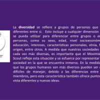 La diversidad se refiere a grupos de personas que son diferentes entre sí. Esto incluye a cualquier dimensión que se pueda utilizar para diferenciar entre grupos o entre personas, como su sexo, edad, nivel socioeconómico, educación, intereses, características personales, etnia, fe u origen, entre otros. A medida que nuestras sociedades son cada vez más diversas, es importante que el Movimiento Scout refleje esta situación y se esfuerce por representar a la sociedad en la que se encuentra inmerso. En la medida en que los grupos humanos son más diversos pueden ser más difíciles de manejar, debido a las diferencias entre sus miembros, pero esta característica también ofrece puntos de vista diferentes y nuevas ideas.