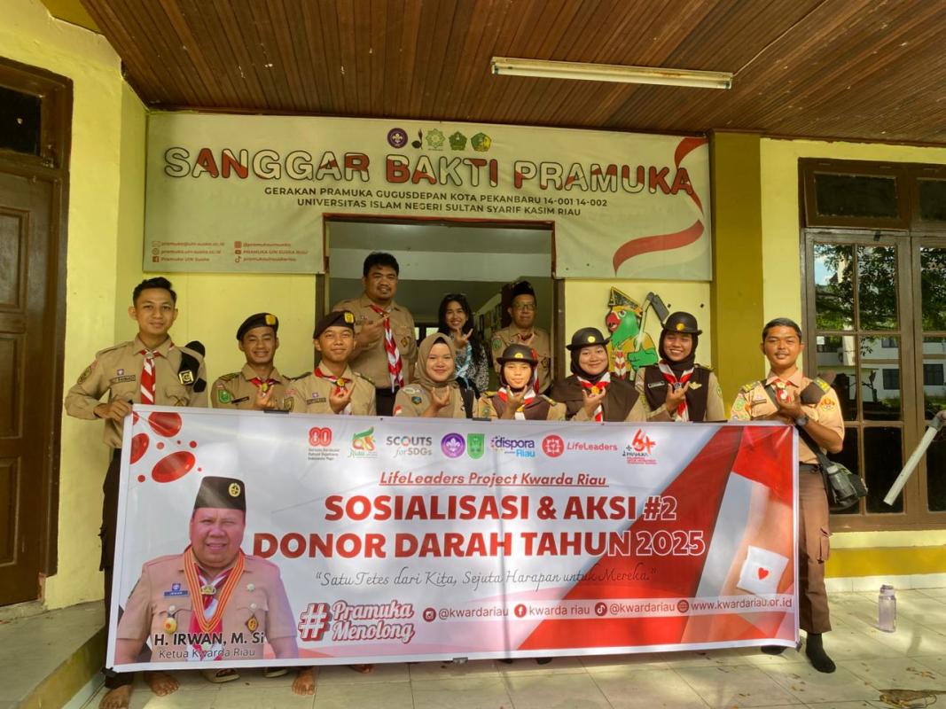 Kami dari Komunitas Pramuka Riau Donor Darah melakukan kegiatan sosialisasi donor darah yang dilaksanakan di Universitas Islam Negeri (UIN) Sultan Syarif Kasim Riau dan Universitas Riau (UNRI) sebagai upaya meningkatkan kesadaran anggota Pramuka untuk ikut menjadi pendonor darah rutin.