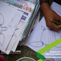 Les pedí a los biólogos que nos dieran un taller sobre las tortugas y mi Asesor, el biólogo Miguel fue a nuestro local donde nos dio la plática, llevo huesos y un caparazón de tortuga, también con mis Viejos Lobos, empezamos a diseñar el material didáctico, unas lonas con las cinco especies de tortugas que llegan y una lámina para colorear y recortar dos especies de tortugas, la tortuga verde y la laúd.