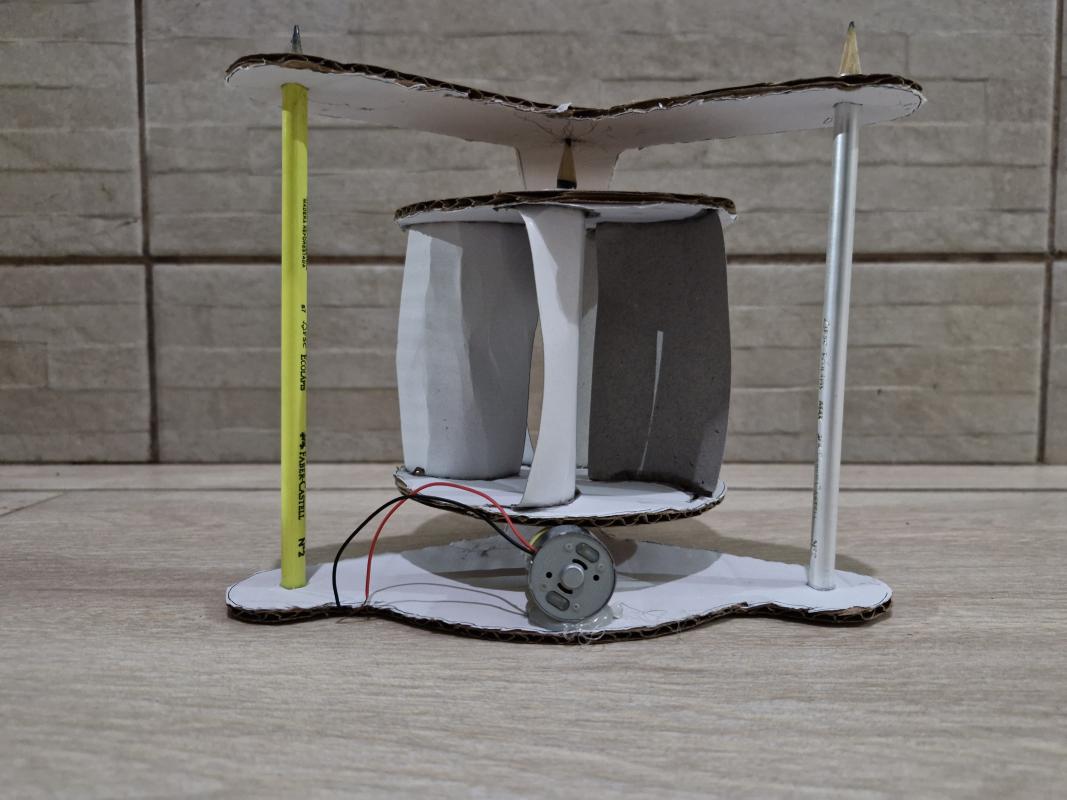 Comecei procurando o projeto de um mini gerador eólico na Internet, depois imprimi os moldes e recortei em papelão, usei lápis e cola para montar a estrutura e papel cartão para as pás, depois na base coloquei um motor de 3 a 6v conectado com uma borracha, que ajudaria a girar o motor, e o colei com cola quente.