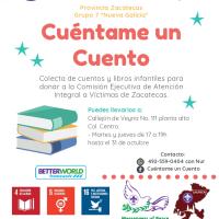 Cuéntame un Cuento es un proyecto para crear una biblioteca infantil en beneficio de los niños que asisten a la Comicsión Ejecutiva de Atención Integral a Víctimas de Zacatecas por haber sufrido algún tipo de abuso, directa o indirectamente, con el objetivo de asegurar que tengan acceso a un ambiente tranquilo que, por medio de la lectura, les ayudará a darle un enfoque positivo a sus vidas.