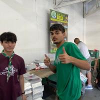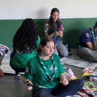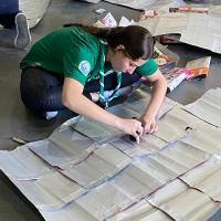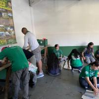 Depois, realizamos uma oficina prática, onde cada participante ajudou a montar os isolantes térmicos, colocando uma caixa dentro da outra e grampeando para formar painéis.