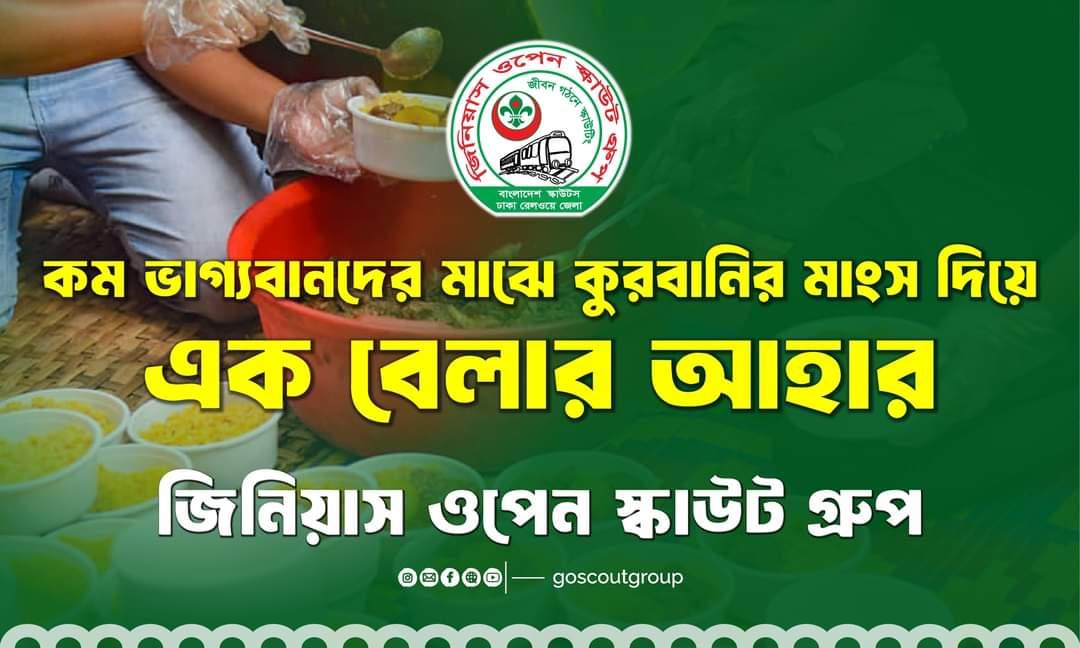 "জিনিয়াস ওপেন স্কাউট গ্রুপ" এর সদস্যরা ০৬ জুলাই, ২০২৪ তারিখে জোড়পুকুর, খিলগাঁও, ঢাকা, বেলা ০১:৩০মিনিট এর সময় ‘এক বেলার আহার’ কর্মসূচির সূচনা করে যাতে আমাদের স্কাউটরা সক্রিয়ভাবে অংশগ্রহণ করে। এই ‘এক বেলার আহার’ কর্মসূচি বাস্তবায়নের জন্য আমরা আগে থেকে কোরবানি মাংস থেকে কিছু মাংস সংগ্রহ করি এবং নিজেদের থেকে কিছু অর্থ দিয়ে যাবতীয় জিনিস ক্রয় করে খাবার রান্না করি। তারপরে তা কিছু খাবারের প্যাকেটে ভরে সকলের মাঝে বিলিয়ে দেই।