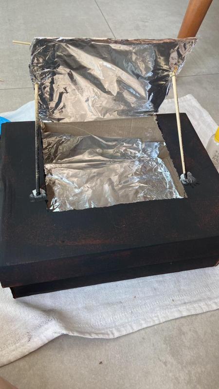 1-Peguei uma caixa de sapato, pintei-a toda de preto cortei um pedaço da tampa e envolvi-a com papel alumínio, depois coloquei dois palitos de churrasco para segurar essa tampa em um ângulo de mais ou menos 60°.