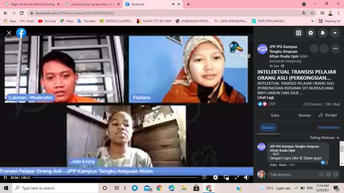 Projek ini adalah anjuran daripada Jawatankuasa Perwakilan Pelajar (JPP) daripada IPG Kampus Tengku Ampuan Afzan, Pahang yang telah menjemput saya dan saudari Fazliana sebagai panel utama yang akan membahaskan tajuk Intelektual Transisi Pelajar Orang Asli. Projek ini telah dilaksanakan secara atas talian dan disiarkan melalui medium facebook JPP IPG Kampus Tengku Ampuan Afzan.
