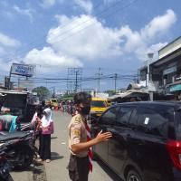 Anggota pramuka membantu mengatur lalu lintas dan membantu penyeberang jalan.