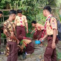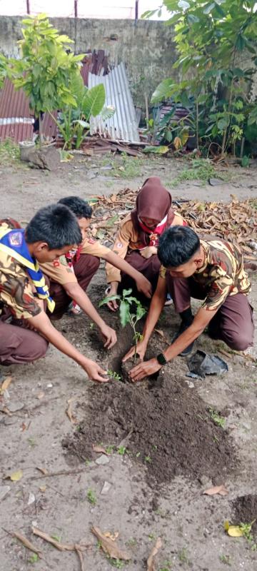 Kami memulai dengan membersihkan sekitaran sanggar Pramuka SMP negeri 3 Tualang terlebih dahulu, dengan memotong rumput liar dan merapikan letak tanaman yang ada. Lalu kami menanam pohon mangga di sekitar taman sanggar tersebut dengan penuh semangat.
