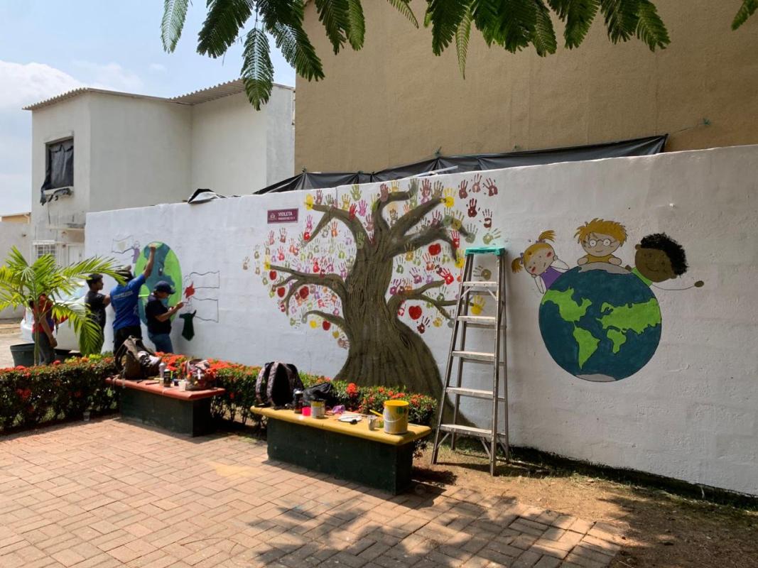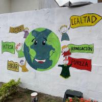 Primero empezamos analizando el entorno donde nos encontrabamos, luego compramos botes de pintura para ponernos manos a la obra, al principio estabamos indecisos de que forma poder dejar una huella en esa zona, por lo cual nos decidimos a pintar los valores scout y una seña de la igualdad en el mundo con representación de un planeta y varios niños alrededor, para nosotros era muy importante detallar el esfuerzo que realizamos porque fue un trabajo en equipo, algo desafiente y muy divertido