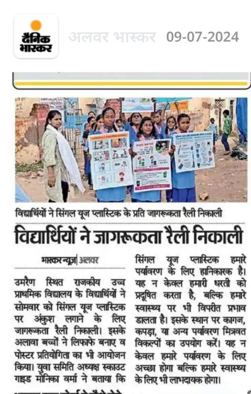 सिंगल यूज़ प्लास्टिक पर अंकुश लगाने के लिए रैली का आयोजन किया गया जिसमे बच्चों ने लिफाफे बनाए तथा पोस्टर प्रतियोगिता का आयोजन किया गया इसके बारे में चर्चा करते हुए सुकल, उमरैन गांव में लोगों को जागरूक करने के लिए रैली निकाली गई