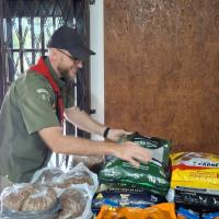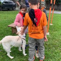 Primeiro, conversamos com a responsável da ONG para entender como poderíamos ajudar. Em seguida, produzimos um folder de divulgação para arrecadação de ração, que foi compartilhado com jovens e responsáveis. Depois, duas representantes da ONG Patudos da Rua foram até nossa sede, apresentaram o trabalho da instituição, falaram das dificuldades enfrentadas e levaram um cachorro resgatado para os jovens conhecerem.