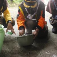 Kumpulan daun kering yang sudah benar-benar kering, lalu sangrai daun itu (bisa juga dibakar), dan pastikan terbakar semua, setelah itu haluskan daun tersebut dan beri tepung tapioka dan air supaya dapat dibentuk