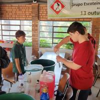 Após a calamidade das enchentes que atingiu o Rio Grande do Sul, a tropa Sênior-Guia Mbya Guarani se reuniu para execução do projeto de produção de desinfetante utilizando garrafas plásticas recicladas para a embalagem. O desinfetante produzido posteriormente será doado para a limpeza de casas atingidas pelas enchentes.