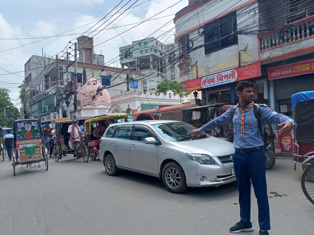 Voluntary Traffic Control Initiative by Pabna District Rover Scouts. Pabna District Rover Scouts undertook a voluntary initiative to help manage traffic. In Bangladesh, during times of unrest or special situations, chaos often arises on the roads, increasing the risk of accidents and causing public suffering. In such conditions, Pabna District Rover Scouts actively participated in traffic control at key intersections of the city. We assisted pedestrians in crossing roads safely, supported the movement of vehicles, and raised awareness about wearing helmets and following traffic rules.