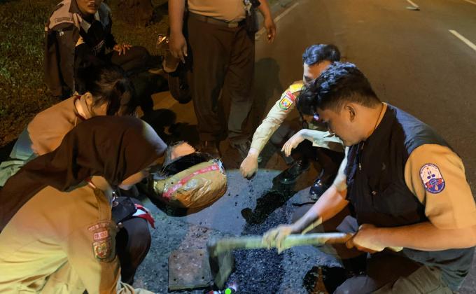 Perbaikan jalan berlubang bersama pramuka UPB