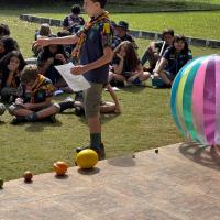 O escoteiro Davi Novais, representou o Sistema Solar utilizando objetos proporcionais: o Sol com uma bola de 1 metro e os planetas com frutas e sementes, mostrando as diferenças de tamanho e a importância da energia solar para cada um.