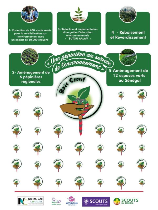 Les Eclaireuses, Scouts et Éclaireurs du Sénégal se sont beaucoup investis dans le reboisement, l’entretien et la préservation de ces ressources naturelles, la restauration des écosystèmes et espèces forestiers ( bande de filaos des Niayes en 1978, le projet écocitoyen Woomal avec les scouts finlandais, le reboisement et à la régénérescence des plantes endémiques de la Grande Muraille verte, le reboisement de 10 000 plants dans la mangrove de Tobor à Bignona (région de Ziguinchor) en partenariat avec les services des Eaux et Forêts de Ziguinchor, la régénérescence faunistique des œufs de tortues dans la réserve de Guembeul (Région de Saint-Louis), forêt classée de Mbao, Parc de Hann……)