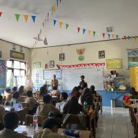 Sementara itu, kelompok lain melanjutkan aktivitas belajar di dalam kelas. Para siswa duduk dengan rapi, mendengarkan penjelasan dari kakak pembina yang berdiri di depan kelas. Suasana kelas tampak hidup, dengan dinding yang penuh hiasan dan warna-warni bendera kecil yang menggantung di langit-langit. Mereka belajar sambil sesekali bertanya, mencatat, dan berdiskusi dengan teman sebangku.