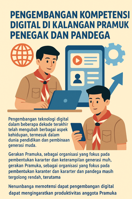 Perkembangan teknologi digital dalam beberapa dekade terakhir telah mengubah berbagai aspek kehidupan, termasuk dalam dunia pendidikan dan pembinaan generasi muda. Gerakan Pramuka, sebagai organisasi yang fokus pada pembentukan karakter dan keterampilan generasi muda, perlu mengintegrasikan kompetensi digital dalam program pendidikannya. Kompetensi digital menjadi keterampilan penting di abad ke-21, namun literasi digital di kalangan anggota Pramuka Penegak dan Pandega masih tergolong rendah, terutama di daerah dengan akses terbatas. Pengembangan kompetensi digital dapat meningkatkan produktivitas anggota Pramuka, namun tantangan seperti keterbatasan akses dan pelatihan menjadi hambatan utama. Oleh karena itu, diperlukan strategi pelatihan berbasis pengalaman dan pendekatan yang disesuaikan dengan kebutuhan anggota, serta dukungan dari pembina dan pelatih pembina yang berkompeten. Pengembangan kompetensi digital yang optimal akan membantu Pramuka Penegak dan Pandega menjadi individu yang adaptif, produktif, dan siap menghadapi tantangan global.