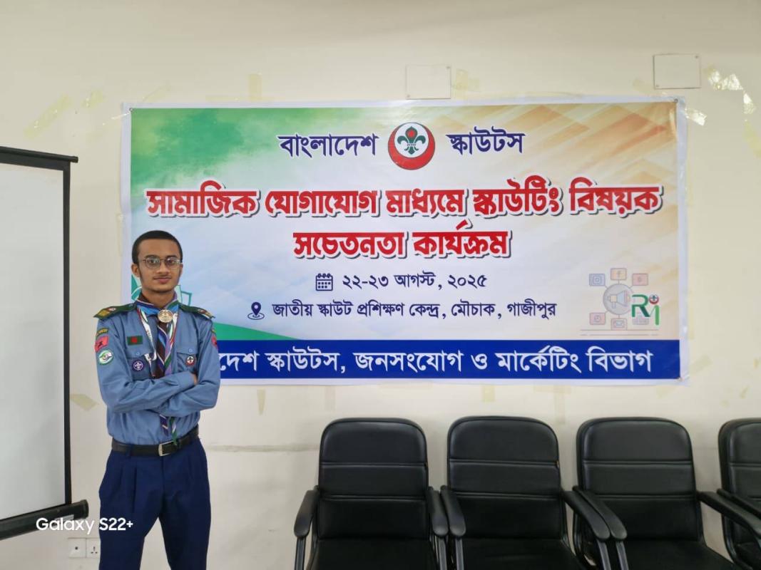 Rover Md. Taihan Rahman Talukder, Senior Rover Mate of Rajuk Uttara Model College Rover Scout Group, successfully participated in the "Scouting Awareness Activities Through Social Media" organized by the Public Relations and Marketing Division of Bangladesh Scouts at the National Scout Training Center, Mouchak, Gazipur, from 22-23 August 2025.