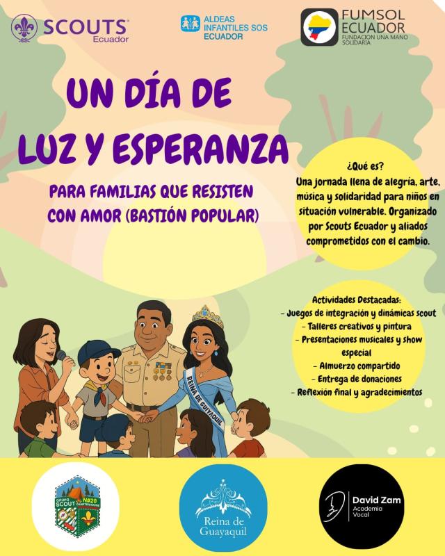 fue una jornada comunitaria organizada en Bastión Popular, Guayaquil, con el objetivo de brindar a niños en situación vulnerable una experiencia significativa llena de arte, juegos scouts, valores y afecto. Con el apoyo de 20 voluntarios y aliados institucionales, se beneficiaron directamente 60 personas a través de actividades recreativas, talleres, donaciones y un almuerzo simbólico. El proyecto fortaleció la empatía, la gratitud y el compromiso social, demostrando que un solo día puede sembrar esperanza en toda una comunidad.