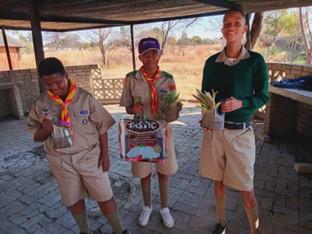 "I shared what I learned at the PTT training with my Crew and Troop members. I asked them to tidy the area at the Montshioa Cultural Village, where we usually have our weekly Troop meetings. We walked around the surroundings and collected plastics and plastic bottles. We reused the plastic bottles to make flower pots and a bag.. My uncle gave us a helping hand by disposing of our binbags correctly."