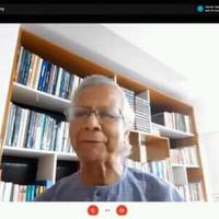On the first day of the three-day event, Nobel Prize-winning economist Dr. The directional video conference of Muhammad Yunus is shown.