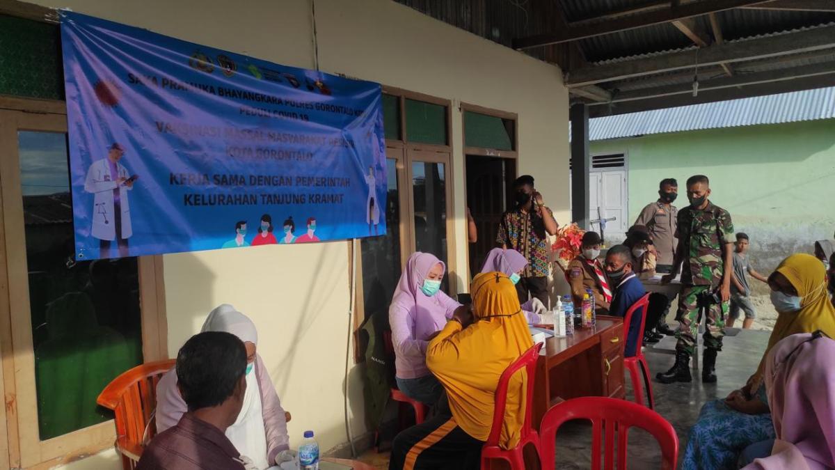 Pandemi COVID-19 menyebabkan dampak luas, termasuk kehilangan pekerjaan, terbatasnya akses kesehatan, dan ketakutan yang melanda masyarakat. Dalam merespons situasi ini, Saka Bhayangkara bekerja sama dengan Polres Gorontalo Kota, Dinas Kesehatan, dan Pemda Kelurahan Tanjung Kramat untuk menyelenggarakan dua inisiatif utama yakni program vaksinasi dan pembagian sembako.