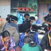 Menlom Chhenmo is an event where spiritual leaders initiate prayers for the peace of all sentient beings. During this sacred gathering, a highly respected lama, similar to a head priest in a church, leads the prayers for everyone's well-being. As part of this event, we helped prepare meals by assisting the cooks, chopping vegetables, and distributing food to the people gathered. To support the occasion, we formed a group and volunteered our time to serve the community. Through these efforts, we not only provided nourishment but also strengthened our sense of unity, compassion, and the spirit of selfless service.