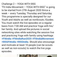 “Fit India Movement – YOGA WITH BSG” is going to be started from 27th August 2020 thrice a week – every Tuesday, Thursday and Saturday. This programme is specially designed for our Youth and Adults as well as nonScouts /Guides. You must watch the live episodes on a regular basis from 7:00 AM and practice Yoga with his/her family. And upload the pictures in social networking sites while watching the session live and practicing Yoga with family using hashtags #FitIndia #FitIndiaRun2020 #FitIndiaMovement #BSGFitIndia #BSGIndia. Should also encourage and motivate at least 10 people (can be scouts as well as non-scouts) to watch the live yoga episodes.