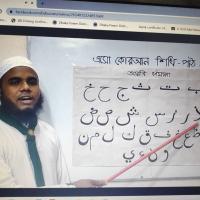 এসো কোরআন শিখি- পাঠ ০১ : আরবি বর্ণমালা ও মাখরাজ। আরবি বর্ণমালা ২৯ টি। যথা - ا ب ت ث ج ح خ د ذ ر ز س ش ص ض ط ظ ع غ ف ق ك ل م ن و ه ء ي মাখরাজ ১৭টি। যে স্থান থেকে হরফ (বর্ণ) উচ্চারিত হয় সে স্থানকে মাখরাজ বলা হয়। যথা : ১। হলক্ব বা গলার শেষভাগ যা বুকের সাথে লাগানো। হলকের শুরু হইতে দু’টি হরফ উচ্চারিত হয়। ء- ه ২। হলকের বা গলার মধ্যভাগ হইতে দু’টি হরফ উচ্চারিত হয়- ع-ح ৩। হলক বা গলার প্রথমভাগ যা মুখের নিকটবর্তী। হলকের শেষ হইতে দু’টি হরফ উচ্চারিত হয় خ -غ ৪। জিহবার গোড়া তার বরাবর উপরের তালুর সঙ্গে লাগাইয়া ق উচ্চারিত হয়। (জিহবার গোড়াটুকু তার সোজা বরাবর উপরের তালুর সাথে ধাক্কা লাগিয়ে ق উচ্চারণ করতে হয়।) ৫। জিহবার গোড়া থেকে একটু সামনের অংশ ও তার বরাবর উপরের তালুর সঙ্গে লাগাইয়া ك উচ্চারিত হয়। (জিহবার গোড়া থেকে একটু সামনের অংশ তার বরাবর উপরের তালুর সাথে ধাক্কা লাগিয়ে ك উচ্চারণ করতে হয়।) ৬। জিহবার মধ্যভাগ তার বরাবর উপরের তালুর সঙ্গে লাগাইয়া ج- ش- ي উচ্চারণ করতে হয়। ৭। জিহবার গোড়ার ডান কিংবা বাম কিনারা এবং উপরের মাড়ির দাঁতের গোড়ার সঙ্গে লাগাইয়া ض উচ্চারিত হয়। ৮। জিহবার আগার কিনারা সামনের উপরের এক পাশের দাঁতের গোড়ার সঙ্গে লাগাইয়া ل (লাম) উচ্চারিত হয়। ৯। জিহবার আগা তার বরাবর উপরের তালুর সঙ্গে লাগাইয়া ن (নূন) উচ্চারিত হয়। ১০। জিহবার আগার পিঠ তার বরাবর উপরের তালুর সঙ্গে লাগাইয়া ر (র) উচ্চারিত হয়। ১১। জিহবার অাগা সামনের উপরের দুই দাঁতের গোড়ার সঙ্গে লাগাইয়া ط-د-ت উচ্চারিত হয়। ১২। জিহবার অাগা সামনের নিচের দুই দাঁতের আগার সঙ্গে লাগাইয়া ص-س-ز উচ্চারিত হয়। ১৩। জিহবার অাগা সামনের উপরের দুই দাঁতের অাগার সঙ্গে লাগিয়ে ظ -ذ ث - উচ্চারণ করতে হয়। ১৪। নিচের ঠোঁটের পেট এবং সামনের উপরের দুই দাঁতের অগ্রভাগ থেকে ف হরফ উচ্চারিত হয়। ১৫। দুই ঠোঁট হতে و-ب -م উচ্চারিত হয়। ب দুই ঠোঁটের ভেতর দিকের ভেজা অংশ একত্রিত করে। م দুই ঠোঁটের কিছুটা বাহির দিকের শুকনো অংশ একত্রিত করে। و দুই ঠোঁটকে সংকুচিত ও গোল করে দুই ঠোঁটের মধ্যখানে সামান্য সরু ফাঁক রেখে উচ্চারণ করতে হয়। ১৬। মুখের খালি জায়গা হইতে মদের হরফ পড়া যায়। মদের হরফ ৩ টি। যবরের বামপাশে খালি আলিফ, পেশের বামপাশে জযম ওয়ালা ওয়াও, যেরের বামপাশে জযম ওয়ালা ইয়া। মদের হরফ এক আলিফ টেনে পড়তে হয়। ا- و- ي এই তিনটি হরফ মুখের ভিতরের শূন্যস্থান থেকে উচ্চারিত হবে। ১৭। নাকের বাঁশি বা নাসিকামূল হতে গুন্না উচ্চারিত হয়। গুন্না হলো- নাক দিয়ে নম্র আওয়াজ বের করা। যেমন- ان – انت আন্না, আংতা।